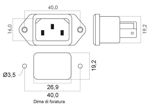** Caratteristiche Generali ** Genere: Spina Norma di riferimento: EN 60320 Foglio tecnico: C14 Colore: Nero ** Caratteristiche Elettriche ** Corrente max: 10A Tensione max: 250V ** Caratteristiche Meccaniche ** Materiale Corpo: Termoplastico rinforzato con fibra di vetro Materiale Contatto: Lega di rame Tipo contatto: faston 4.8mm Montaggio connettore: pannello Foro fissaggio: 26.9mm x 19.2mm ** Caratteristiche Termiche ** Temperatura di lavoro: 0/70°C