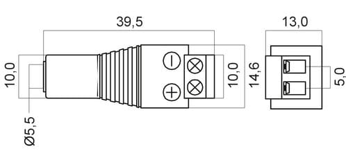 ** Caratteristiche Generali ** Genere: Presa Orientamento: Dritto Tipo Connettore A: 5,5-2,1 Genere A: Presa Tipo Connettore A: Presa 5,5-2,1 Tipo Connettore B: Morsetto a vite Tipo Connettore B: Morsetto a vite 2 poli ** Caratteristiche Meccaniche ** Materiale Corpo: PVC Materiale Contatto: Ottone nichelato