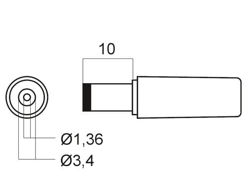 ** Caratteristiche Generali ** Genere: Spina Colore: Nero Orientamento: Dritto ** Caratteristiche Meccaniche ** Materiale Corpo: PVC Materiale Contatto: Ottone nichelato Tipo contatto: a saldare Montaggio connettore: volante Diametro Esterno: 3.4mm Diametro Interno: 1.36mm Lunghezza Contatto: 10mm