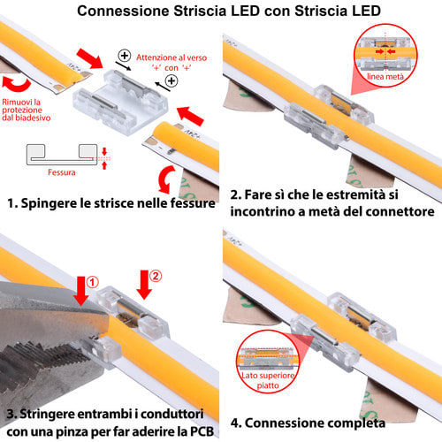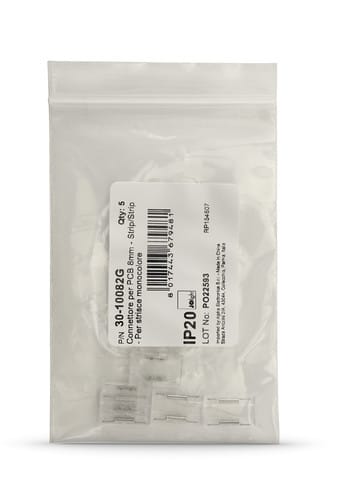 ** Caratteristiche Generali ** Adatto per tipo di Led: COB, SMD Adatto per striscia: Monocolore Larghezza nastro: 8mm Tipo connettore: Giunto N. Poli: 2 ** Caratteristiche Elettriche ** Tens. funzionamento DC: 3‑24Vdc Corrente max: 5.5A ** Caratteristiche Meccaniche ** Lunghezza: 15.6mm Larghezza: 9.6mm Altezza: 3.3mm Grado di protezione: IP20 Tipo contatto: a crimpare