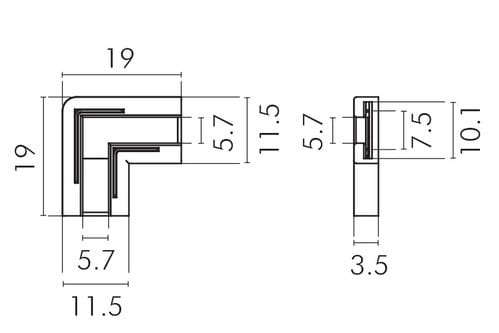 ** Caratteristiche Generali ** Adatto per tipo di Led: COB, SMD Adatto per striscia: Monocolore Larghezza nastro: 10mm Tipo connettore: Giunto ad angolo N. Poli: 2 ** Caratteristiche Elettriche ** Tens. funzionamento DC: 3‑24Vdc Corrente max: 4A ** Caratteristiche Meccaniche ** Lunghezza: 19mm Larghezza: 11.5mm Altezza: 3.5mm Grado di protezione: IP20 Tipo contatto: a crimpare
