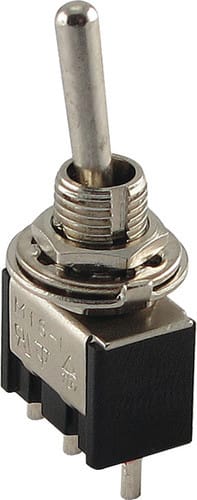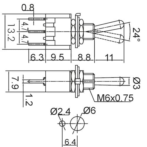 ** Caratteristiche Generali ** Attuatore: Levetta Serie: Miniatura Serigrafia: Nessuna Luminoso: no Materiale attuatore: Ottone nichelato Tipi contatti: SPDT Portata: 3A@250Vac, 6A@125Vac N. poli: 1 Stato dei contatti: (ON)/ON Tipo terminale: cs N. terminali: 3 Montaggio: Pannello con dado Foro fissaggio: ø6mm