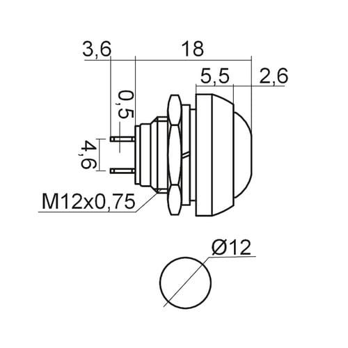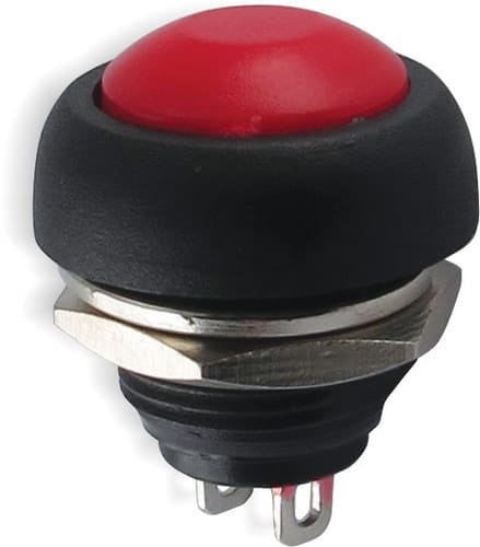 ** Caratteristiche Generali ** Attuatore: Pulsante Serigrafia: Nessuna Luminoso: no Colore: Rosso Materiale attuatore: Plastica Tipi contatti: SPST Portata: 1A@250Vac, 3A@125Vac N. poli: 1 Stato dei contatti: OFF/(ON) - N.A. Tipo terminale: a saldare N. terminali: 2 Montaggio: Pannello con dado Foro fissaggio: ø12mm