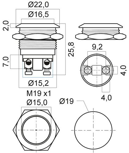 ** Caratteristiche Generali ** Attuatore: Pulsante antivandalo Serie: Antivandalo Forma dell'attuatore: Convesso Serigrafia: Nessuna Luminoso: no Colore: Metallo Materiale attuatore: Acciaio Tipi contatti: SPST Portata: 3A@250Vac, 5A@125Vac N. poli: 1 Stato dei contatti: OFF/(ON) - N.A. Tipo terminale: vite N. terminali: 2 Montaggio: Pannello con dado Foro fissaggio: ø19mm Grado di protezione: IP65 Temperatura di lavoro: -30 / 70°C