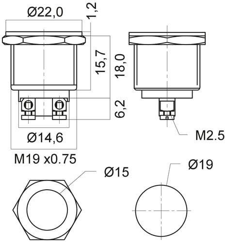 ** Caratteristiche Generali ** Attuatore: Pulsante antivandalo Serie: Antivandalo Forma dell'attuatore: Piatto Serigrafia: Nessuna Luminoso: no Colore: Metallo Materiale attuatore: Ottone nichelato Tipi contatti: SPST Portata: 2A@250Vac, 4A@125Vac N. poli: 1 Stato dei contatti: OFF/(ON) - N.A. Tipo terminale: vite N. terminali: 2 Montaggio: Pannello con dado Foro fissaggio: ø19mm Note aggiuntive: antivandalo piano Grado di protezione: IP65 Temperatura di lavoro: -20 / 55°C