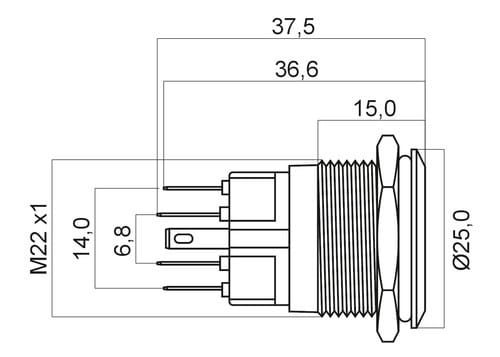 ** Caratteristiche Generali ** Attuatore: Pulsante antivandalo Serie: Antivandalo Forma dell'attuatore: Piatto Luminoso: si Colore illuminazione: Rosso Tensione illuminazione: 24Vac/dc Colore: Metallo Materiale attuatore: Acciaio Tipi contatti: SPST Portata: 5A@250Vac, 5A@36Vdc N. poli: 2 Stato dei contatti: N.C. + N.A. Tipo terminale: a saldare N. terminali: 6 Montaggio: a pannello Foro fissaggio: ø22mm Grado di protezione: IP65 Temperatura di lavoro: -20 / 55°C