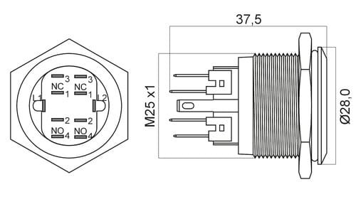 ** Caratteristiche Generali ** Attuatore: Pulsante antivandalo Serie: Antivandalo Forma dell'attuatore: In rilievo Luminoso: si Colore illuminazione: Verde Tensione illuminazione: 24Vac/dc Colore: Lucido Materiale attuatore: Acciaio Tipi contatti: SPST Portata: 5A@250Vac, 5A@36Vdc N. poli: 4 Stato dei contatti: 2 x N.C. + 2 x N.A. Tipo terminale: a saldare N. terminali: 10 Montaggio: Pannello con dado Foro fissaggio: ø25mm Grado di protezione: IP65 Temperatura di lavoro: -10 / 40°C