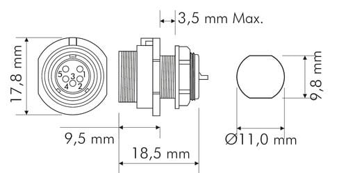 ** Caratteristiche Generali ** Genere: Presa Orientamento: Dritto Nr. Poli: 5 Serie Fornitore: SP11 ** Caratteristiche Elettriche ** Corrente max: 3A Tensione max: 180V ** Caratteristiche Meccaniche ** Materiale Corpo: Nylon Materiale Contatto: Lega dirame dorata Tipo contatto: a saldare Montaggio connettore: pannello Sezione conduttori: 0-0.79mm² Grado di protezione: IP68 ** Caratteristiche Termiche ** Temperatura di lavoro: -25/80°C