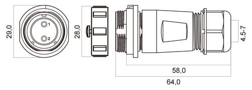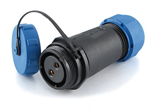 ** Caratteristiche Generali ** Genere: Presa Orientamento: Dritto Nr. Poli: 2 Serie Fornitore: SP21 ** Caratteristiche Elettriche ** Corrente max: 30A Tensione max: 500V ** Caratteristiche Meccaniche ** Materiale Corpo: Nylon Materiale Contatto: Lega di rame dorata Tipo contatto: a saldare Montaggio connettore: volante Sezione conduttori: 0-4mm² Diametro cavo min: 4.5mm Diametro cavo max: 7mm Grado di protezione: IP68 ** Caratteristiche Termiche ** Temperatura di lavoro: -25/80°C