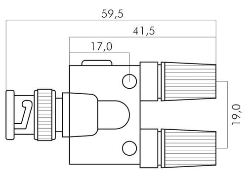** Caratteristiche Generali ** Genere: Adattatore Tipo Connettore A: BNC Genere A: Spina Tipo Connettore A: Spina BNC Tipo Connettore B: Boccole Tipo Connettore B: 2x Boccole ** Caratteristiche Meccaniche ** Materiale Corpo: Ottone nichelato Materiale Isolamento: Delrin