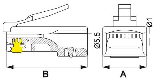** Caratteristiche Generali ** Genere: Spina Categoria: CAT.5e Colore: Trasparente Nr. Poli: 8 Configurazione Poli: 8P8C Adatto per tipo conduttore: Trefolo + Rigido Sezione AWG: AWG24-26 Tipo Clip: Standard ** Caratteristiche Elettriche ** Schermatura:no ** Caratteristiche Meccaniche ** Materiale Corpo: PC UL 94V-2 Materiale Contatto: Bronzo fosforoso Placcatura contatti: Contatti dorati Tipo contatto: 3-prong Diametro conduttori max: 1mm Diametro cavo max: 5.5mm Inserti: 0 Placcatura: 50µm Formato Corpo: Standard Dim. A: 11.68mm Dim. B: 21.48mm ** Caratteristiche Termiche ** Classe di infiammabilità: UL94V-2