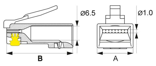 ** Caratteristiche Generali ** Genere: Spina Categoria: CAT.6 Colore: Trasparente Nr. Poli: 8 Configurazione Poli: 8P8C Adatto per tipo conduttore: Trefolo + Rigido Sezione AWG: AWG24-26 Tipo Clip: Standard ** Caratteristiche Elettriche ** Schermatura: no ** Caratteristiche Meccaniche ** Materiale Corpo: PC UL 94V-2 Materiale Contatto: Bronzo fosforoso Placcatura contatti: Contatti dorati Tipo contatto: 3-prong Diametro conduttori max: 1mm Diametro cavo max: 6mm Inserti: 0 Placcatura: 50µm Formato Corpo: Standard Dim. A: 11.68mm Dim. B: 21.48mm ** Caratteristiche Termiche ** Classe di infiammabilità: UL94V-2
