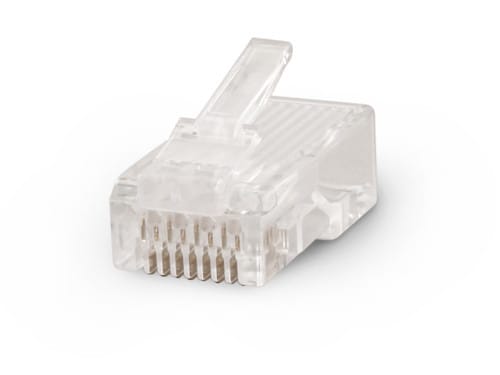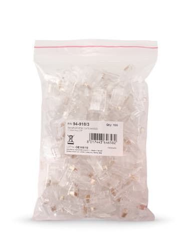 ** Caratteristiche Generali ** Genere: Spina Categoria: CAT.6 Colore: Trasparente Nr. Poli: 8 Configurazione Poli: 8P8C Adatto per tipo conduttore: Trefolo + Rigido Sezione AWG: AWG23-24 Tipo Clip: Standard ** Caratteristiche Elettriche ** Schermatura: no ** Caratteristiche Meccaniche ** Materiale Contatto: Bronzo fosforoso Placcatura contatti: Contatti dorati Tipo contatto: 3-prong Montaggio connettore: volante Diametro conduttori max: 1.1mm Diametro cavo max: 6.5mm Placcatura: 50µm Formato Corpo: Standard ** Caratteristiche Termiche ** Classe di infiammabilità: UL94V-2