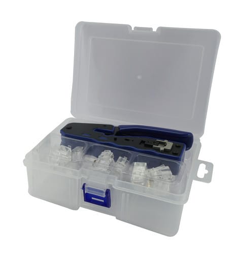 Kit valigetta per crimpatura connettori RJ45 passanti. La pratica valigetta contiene tutto il necessario per semplificare la crimpatura dei connettori RJ45 per reti LAN. La pinza è compatibile anche con i connettori RJ45 tradizionali. ** Contenuto confezione ** 98-168: pinza RJ45 15pz spine RJ45 Cat.5e UTP Cacciavite ** Caratteristiche Generali ** Funzione: Crimpatura Adatta per connettori: RJ45 8P8C Chiusura: a cricchetto Inserto: fisso Materiale corpo: Acciaio Materiale impugnatura: PVC Forma impugnatura: Antiscivolo ed ergonomica