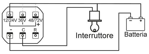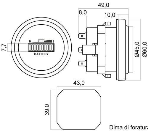 ** Caratteristiche ** Indicatore della tensione di batteria con Bra-Graph. ** Dati tecnici ** Tensione operativa: 12/24/36/48/72V con interruttore Auto consumo: 20mA ** Parametri misurati: ** Tensione: 12/24/36/48/72V con alimentazione da batteria ** Display ** Display 3 colori (1 rosso, 2 gialli e 7 verdi Dima di foratura: 43x39 ** Caratteristiche Generali ** Grado Protezione: IP65 ** Caratteristiche Elettriche ** Tensione d'ingresso: 12‑72Vdc ** Caratteristiche Meccaniche ** Dimensioni (LxWxH): 60 x 60 x 49mm Materiale contenitore: Plastico Colore: Nero Connessioni: faston 6,3 ** Caratteristiche Termiche ** Temperatura di lavoro: -10/40°C