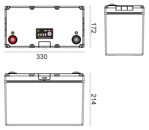 ** Caratteristiche Generali ** Tecnologia: LiFePO4 Caratteristiche aggiuntive: con predisposizione per display esterno, con riscaldatore integrato Cicli di vita: 3500 ** Caratteristiche Elettriche ** Tensione: 12.8V Capacità: 100Ah Energia: 12800KWh Corrente di carica raccomandata: 50A Tensione di carica stand-by: 14.6V Corrente di scarica massima: 100A Connessione parallelo: 2 Connessione serie: 4 Protezioni: Corto circuito, Scarica eccessiva, Sovratemperatura ** Caratteristiche Meccaniche ** Dimensioni: 330mm x 172mm x 214mm Peso: 10.5Kg Grado di protezione: IP30 Connessioni: a vite M8 Materiale contenitore: ABS Temperatura di lavoro: 0 / 50°C Umidità: 0 / 95%