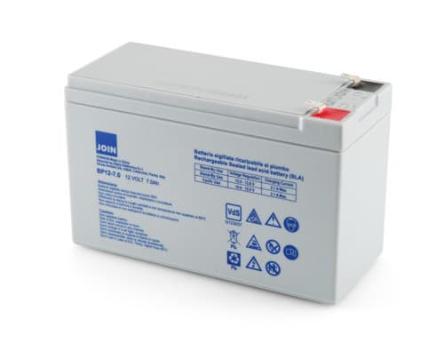 ** Caratteristiche Generali ** Adatto per: UPS, Impianti di allarme, Sistemi fotovoltaici ad isola Tecnologia: Piombo AGM ** Caratteristiche Elettriche ** Tensione: 12V Capacità: 7Ah Corrente di carica massima: 2.1A Tensione di carica stand-by: 13.8V Tensione di carica uso ciclico: 14.5V Corrente di scarica massima: 70A @ 5s Corrente di scarica raccomandata: 0.7A Prof.di scarica raccomandata: 90% ** Caratteristiche Meccaniche ** Dimensioni: 65mm x 151.5mm x 95mm Peso: 2Kg ± 5% Grado di protezione: IP20 Connessioni: faston 4.8mm Materiale contenitore: ABS UL94-HB Temperatura di immagazzinamento: -20 / 60°C Temperatura di lavoro: 0 / 50°C Umidità: 40 / 80%