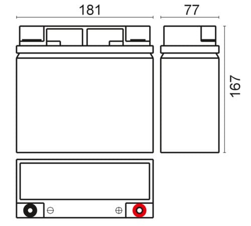 ** Caratteristiche Generali ** Adatto per: UPS Tecnologia: Piombo AGM ** Caratteristiche Elettriche ** Tensione: 12V Capacità: 18Ah Potenza (15min 1,67V/cella 25°C): 70W Corrente di carica massima: 5.4A Corrente di scarica massima: 180A ** Caratteristiche Meccaniche ** Dimensioni: 181mm x 77mm x 167mm Peso: 5.35Kg ± 5% Connessioni: a vite Materiale contenitore: UL94 V0 Temperatura di immagazzinamento: -20 / 60°C Temperatura di lavoro: 0 / 50°C