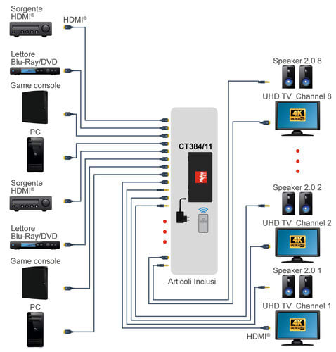 La matrice HDMI® CT384/11 permette la connessione di 8 sorgenti HDMI® a 8 uscite video come TV o monitor permettendo la scelta di qualunque ingresso per ogni uscita. La selezione della combinazione di collegamento tra ingressi e uscite può essere effettuata tramite tasti, tramite il telecomando fornito in dotazione, tramite controllo TCP/IP o tramite seriale RS-232. ** ATTENZIONE ** : la matrice è dotata di funzione scaler permette quindi la riduzione automatica della risoluzione da 4K a 1080p. ** Specifiche ** - Funzione scaler da 4K a 1080p - Supporto HDR, HDR10, HDR10+, Dolby Vision, HLG - Dimensioni 440x200x44,5mm - Peso 2,8Kg - Consumo 43W max ** Specifiche HDMI® ** - Conforme HDCP 2.2 - 4K@60Hz YUV 4:4:4 - Spazio colore RGB, YCbCr, xvYCC - DeepColor - Supporto Audio LPCM2.0ch, PCM5.1ch, PCM7.1ch, DolbyDigital/Plus/EX, Dolby TrueHD, DTS, DTS-EX, DTS-96/24, DTS High RES, DTS-HD Master Audio, Dolby Atmos, DTS:X - Auto lip-sync - Trasmissione dei comandi CEC (CEC Bypass) ** Caratteristiche ** Ingresso: 8 HDMI® Uscita: 8 HDMI®|Audio COAX|Audio L/R Compatibile 3D: si Compatibile 4K: si Risoluzione massima: 4Kx2K@60Hz Funzioni aggiuntive: IR, HDR, ARC, Scaler, RS232, LAN ** Contenuto confezione ** 1x Matrice HDMI® 1x Telecomando IR 1x Alimentatore 12Vdc 5A 1x Staffe di montaggio 1x Cavo ricevitore IR ** Down scaling: ** Solo il formato video HDMI® 4K@30/50/60Hz (spazio colore YUV 4:4:4 oppure 4:2:0) può essere scalato a 1080p@30/50/60Hz. Lo scaler non supporta il down scaling di segnali con spazio colore RGB. ** Nota: ** in modalità SCALER, la matrice non permette la gestione dell’HDR. La matrice trasferisce in uscita l'HDR solo a patto che tutte le TV connesse siano 4K e che entrambe supportino l'HDR. Attenzione: spesso l'HDR deve essere abilitato nel menù di configurazione della TV.
