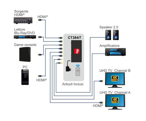 La matrice HDMI® CT384/7 permette la connessione di 4 sorgenti HDMI® a 2 uscite video come TV o monitor permettendo la scelta di qualunque ingresso per ogni uscita. La selezione della combinazione di collegamento tra ingressi e uscite può essere effettuata tramite tasti meccanici oppure tramite il telecomando fornito in dotazione. ** ATTENZIONE ** : la matrice è dotata di funzione scaler permette quindi la riduzione automatica della risoluzione da 4K a 1080p. ** Specifiche ** - Canali selezionabili tramite pulsanti o telecomando - Consumo: 5W max ** Specifiche HDMI® ** - Supporto HDR (High Dynamic Range) - Conforme HDCP 2.2 - 4K@60Hz YUV 4:4:4 - Spazio colore RGB, YCbCr, xvYCC - Deep Color - Audio LPCM a 8 canali, 192 kHz, 24bit - Supporto ARC (Audio Return Channel) - Supporto DVD Audio - Supporto Super Audio CD - Compatibile Dolby TrueHD - Compatibile DTS HD Master Audio - Auto lip-sync - Trasmissione dei comandi CEC (CEC Bypass) - Dimensioni 210x66x26,5mm ** Caratteristiche ** Ingresso: 4 HDMI® Uscita: 2 HDMI®|Audio L/R|TosLink® Compatibile 3D: si Compatibile 4K: si Profondità colore: 12bit/canale Risoluzione massima: 4Kx2K@60Hz Funzioni aggiuntive: Scaler, HDR, IR, ARC ** Contenuto confezione ** 1x Matrice HDMI® 1x Telecomando IR con batteria CR2025 1x Alimentatore 12Vdc 1A - 5,5x2,1 Positivo centrale ** Down scaling: ** Solo il formato video HDMI® 4K@30/50/60Hz (spazio colore YUV 4:4:4 oppure 4:2:0) può essere scalato a 1080p@30/50/60Hz. Lo scaler non supporta il down scaling di segnali con spazio colore RGB. ** Nota: ** in modalità SCALER, la matrice non permette la gestione dell’HDR. La matrice trasferisce in uscita l'HDR solo a patto che tutte le TV connesse siano 4K e che entrambe supportino l'HDR. Attenzione: spesso l'HDR deve essere abilitato nel menù di configurazione della TV.