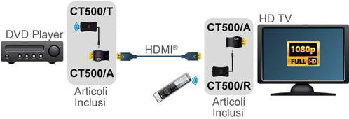Grazie all'innovativa tecnologia IR over HDMI questi accessori consentono di implementare il trasporto del segnale IR (infrarosso) dei telecomandi all'interno dell'impianto attraverso i cavi HDMI stessi. Questi accessori devono essere utilizzati solo coni dispositivi (matrici, distributori ed extender) compatibili. In questo modo sarà possibile controllare le funzioni delle sorgenti (ad esempio la funzione Play, Pausa, Stop) tramite il telecomando originale della sorgente e di selezionare la sorgente desiderata tramite il telecomando del dispositivo (matrice oppure distributore) in dotazione. ** Caratteristiche ** Tipologia: Ricevitore Topologia collegamento: 1:1 ** CT500/R - Ricevitore IR ** Ricevitore IR - Riceve il segnale dal telecomando e lo rende disponibile sul connettore Jack 3,5mm Lunghezza cavo: 1,5m ** Possibile collegamento (vedi disegno) ** - Connettere l'adattatore CT500/A al televisore e al ricevitore IR CT500/R; - collegare un secondo adattatore CT500/A al Lettore DVD e al trasmettitore IR CT500/T; - tramite il cavo HDMI connettere i due adattatori. Il segnale del telecomando puntato verso il CT500/R sarà ri-trasmesso dal CT500/T posto vicino al lettore DVD. E' inoltre possibile utilizzare i prodotti CT500/A, CT500/T e CT500/R in combinazione con alcuni switch, distributori e matrici che supportano la trasmissione del segnale IR sui cavi HDMI. Di seguito sono riportati i prodotti compatibili. ** Elenco articoli compatibili con CT500/T e CT500/R: ** CT304/5 CT308/5 CT322/5 CT378/5R CT378/5T CT378/5DC CT385/5 CT386/5 Attenzione: Il sistema funziona solo con cavi HDMI passivi. Non funziona con cavi HDMI attivi.