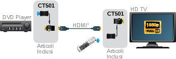 Grazie all'innovativa tecnologia IR over HDMI questi accessori consentono di implementare il trasporto del segnale IR (infrarosso) dei telecomandi all'interno dell'impianto attraverso i cavi HDMI stessi. Questi accessori devono essere utilizzati solo coni dispositivi (matrici, distributori ed extender) compatibili. In questo modo sarà possibile controllare le funzioni delle sorgenti (ad esempio la funzione Play, Pausa, Stop) tramite il telecomando originale della sorgente e di selezionare la sorgente desiderata tramite il telecomando del dispositivo (matrice oppure distributore) in dotazione. Il Kit CT501 è composto da: ** 2x Adattatori ** Adattatore HDMI passante al quale è possibile collegare il ricevitore IR o il trasmettitore. Inietta o preleva il segnale IR trasmesso lungo il cavo HDMI. ** 1x Cavetto Ricevitore IR ** Ricevitore IR - Riceve il segnale dal telecomando e lo rende disponibile sul connettore Jack 3,5mm Lunghezza cavo: 1,5m ** 1x Cavetto Trasmettitore IR ** Trasmettitore IR - Emette il segnale infrarosso ricevuto tramite il connettore Jack 3,5mm Lunghezza cavo: 1,5m ** Possibile collegamento (vedi disegno) ** - connettere il primo adattatore al televisore e al cavetto ricevitore IR; - collegare il secondo adattatore al Lettore DVDe al cavetto trasmettitore IR; - tramite il cavo HDMI connettere i due adattatori. Il segnale del telecomando puntato verso il ricevitore IR sarà ri-trasmesso dal trasmettitore IR posto vicino al lettore DVD. ** Attenzione: ** Il sistema funziona solo con cavi HDMI passivi. Non funziona con cavi HDMI attivi. ** Alimentazione: ** non richiesta. ** Caratteristiche ** Tipologia: Trasmettitore+Ricevitore Topologia collegamento: 1:1