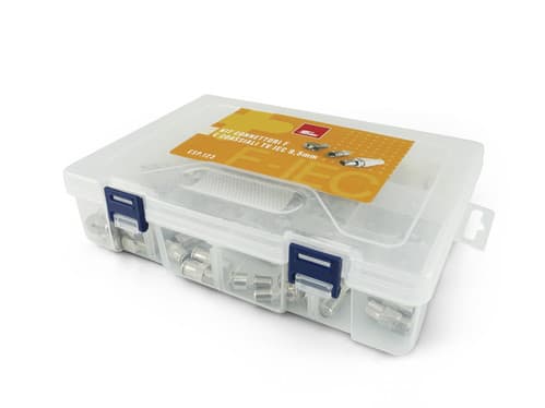 Pratica valigetta contenente un assortimento di connettori e adattatori d'antenna F e IEC da 9,5mm (103pz). Ideale per avere a disposizione i componenti più diffusi per il collegamento di impianti satellite TV. Contenuto valigetta: 5pz 53-2 5pz 54-6 4pz55 4pz 56 20pz 86-014T/2 20pz 86-015TA/2 20pz 86-019TS 5pz 86-029 5pz 86-032 5pz 86-062 5pz 86-063 5pz 88-620 ** Caratteristiche Generali ** Tema: Connettori/adattatori F e antenna TV