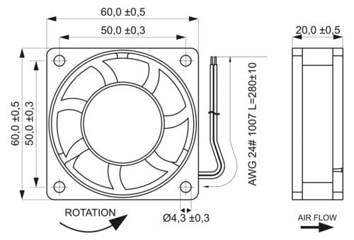 ** Caratteristiche Generali ** Velocità di rotazione: 5000RPM Flusso aria: 0.58, (20.5) Pressione statica: 4.7, (0.19) Rumorosità: 37dB Cuscinetti: A sfera Tipo ventola: Assiale Sensore di arresto: Si ** Caratteristiche Elettriche ** Tipo tensione: DC Corrente nominale: 0.32A Potenza: 3.8W ** Caratteristiche Meccaniche ** Dimensioni (LxWxH): 60 x 60 x 20mm Peso: 0.05kg Materiale girante: PBT Materiale contenitore: PBT Colore: Nero Conduttori: 2 fili Connessioni: cavi liberi ** Caratteristiche Termiche** Grado di infiammabilità: 94V-0 Temperatura di lavoro: -25/70°C Temperatura di stoccaggio: -40/75°C