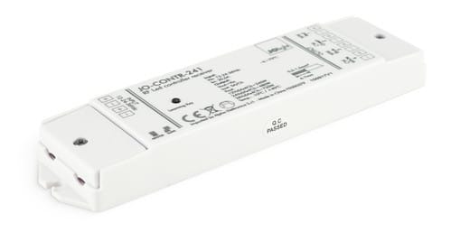 Ricevitore RF multifunzione a 4 canali per strisce led. Questo controller funziona da ricevitore per opportuni telecomandi a radio frequenza attraverso i quali è possibile comandare la scelta dei colori e dell’intensità nel caso di nastri RGBW, dell'intensità e della temperatura di colore (CCT) nel caso di strisce led bianchi bicolore o della sola intensità nel caso di strisce monocolore. Il telecomando deve essere ordinato separatamente in base alle esigenze di controllo. Il dispositivo JO-CONTR-241 mantiene memoria dell'ultimo modo di funzionamento impostato anche dopo aver spento e riacceso l'alimentazione. ** Caratteristiche Generali ** Funzione: Controller Adatto per: RGBW, CCT Regolabile, Monocolore Metodo di controllo: RF ** Caratteristiche Elettriche ** Tipo regolazione: Tensione costante (CV) Tensione d'ingresso: 12/24/36/48V Tensione d'uscita: come ingresso Tipo di uscita: morsetti Metodo di connessione: anodo comune Corrente/Ch: 5A n. canali: 4 Potenza nominale (12V): 240W Potenza nominale (24V): 480W Potenza nominale (48V): 720W ** Caratteristiche Meccaniche ** Lunghezza: 178.9mm Larghezza: 45.5mm Altezza: 18.6mm Grado di protezione: IP20 Materiale corpo: Plastica Colore corpo: Bianco ** Caratteristiche Termiche ** Temp. di funzionamento:-10 / 40°C ** Note ** Questo controller ricevitore JO-CONTR-241 necessita di almeno un telecomando compatibile per essere comandato (vedi articoli correlati). Un ricevitore JO-CONTR-241 può lavorare con più telecomandi (fino a 6) dello stesso tipo. Un telecomando può lavorare con tanti ricevitori (fino a 100 per ogni zona a patto che tutti i dispositivi coinvolti siamo all’interno del raggio di 30m). Al momento dell'installazione i telecomandi devono essere associati a tutti i relativi ricevitori tramite il tasto “Learning key” presente sul ricevitore. L'alimentatore dovrà essere scelto in funzione del tipo di carico led utilizzato per tensione e corrente. Utilizzare un alimentatore con potenza nominale maggiore rispetto al carico led da alimentare (circa 30%).