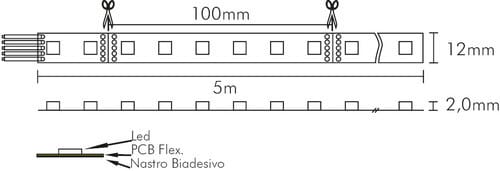** Descrizione ** Nastro Led RGB + W (disponibile nel colore bianco naturale o bianco caldo). ** Caratteristiche Generali ** Applicazione: Decorativa Tempo di vita L70B50: 20000h Numero cicli di accensione: 10000 cicli Fattore di sopravvivenza: 0.9 Tiponastro: RGBW Colore Supporto: Bianco Tipo di led: smd 5050 n. Led al metro: 60 led/m Lunghezza max in cascata: 5m Rischio fotobiologico: Esente ** Caratteristiche di Illuminazione ** Colore: RGBW Flusso Nastro Led: 330lm/m Flusso: R:120lm/m G:240lm/m B:40lm/m W:330lm/m Flusso @ 50cm: 165lm Lunghezza d'onda: R:624nm G:525nm B:470nm CRI: 80 Angolo di emissione: 120° Warm-up (60%): 0.1s Fattore mantenimento flusso: 0.96 Uniformità colore (SDCM): 6 ** Caratteristiche Elettriche ** Classe energetica: G Potenza Nastro Led: 14.4W/m Potenza 50cm: 2.1W Potenza unità minima: 1.44W Tens. funzionamento DC: 24Vdc Dimmerabile: si Alimentatore: Esterno (non incluso) ** Caratteristiche Sorgente Luminosa ** Temp. Colore: 3000K ** Caratteristiche Meccaniche ** Lunghezza nastro: 5m N. Led/taglio: 6 Lunghezza taglio minima: 100mm Larghezza: 5000mm Spessore: 2mm Altezza: 12mm Fissaggio: Biadesivo 3M Grado di protezione: IP20 Tipo di protezione: Nessuno Connessioni: Cavo libero ** Caratteristiche Termiche ** Temp. di funzionamento: -10 / 40°C Potenza W: 4,2W Potenza RGB: 10W