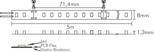 ** Caratteristiche Generali ** Applicazione: Per illuminazione Tempo di vita L70B50: 20000h Numero cicli di accensione: 10000 cicli Fattore di sopravvivenza: 0.9 Tipo nastro: Monocolore Colore Supporto: Bianco Tipo di led: smd 2835 0.2W n. Led al metro: 112 led/m Lunghezza max in cascata: 5m Rischio fotobiologico: Esente ** Caratteristiche di Illuminazione ** Colore: Bianco freddo Flusso Nastro Led: 1550lm/m Flusso @ 50cm: 774lm CRI: 90 Angolo di emissione: 120° Warm-up (60%): 0.1s Fattore mantenimento flusso: 0.96 Uniformità colore (SDCM): 6 ** Caratteristiche Elettriche ** Classe energetica: F Potenza Nastro Led: 14.4W/m Potenza 50cm: 7.2W Potenza unità minima: 1.02816W Tens. funzionamento DC: 24Vdc Dimmerabile: si Alimentatore: Esterno (non incluso) ** Caratteristiche Sorgente Luminosa ** Temp. Colore: 6000K ** Caratteristiche Meccaniche ** Lunghezza nastro: 5m N. Led/taglio: 8 Lunghezza taglio minima: 71.4mm Larghezza: 5000mm Spessore: 1.3mm Altezza: 8mm Fissaggio: Biadesivo 3M Grado di protezione: IP20 Tipo di protezione: Nessuno Connessioni: Cavo libero ** Caratteristiche Termiche ** Temp. di funzionamento: -10 / 40°C