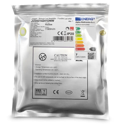 Striscia led digitale dimmerabile controllabile a singoli tratti detti pixel. Tramite il controller ALC244 è possibile realizzare effetti di animazione progressivi detti running. ** Caratteristiche Generali ** Applicazione: Per illuminazione Tempo di vita L70B50: 20000h Numero cicli di accensione: 10000 cicli Fattore di sopravvivenza: 0.9 Colore Supporto: Bianco Tipo di led: COB Lunghezza max in cascata: 5m Rischio fotobiologico: Esente ** Caratteristiche di Illuminazione ** Colore: Bianco naturale Flusso Nastro Led: 1160lm/m Flusso @ 50cm: 580lm CRI: 90 Warm-up (60%): 0.1s Fattore mantenimento flusso: 0.95 Uniformità colore (SDCM): 6 ** Caratteristiche Elettriche ** Classe energetica: G Potenza Nastro Led: 14W/m Potenza 50cm: 7W Potenza unità minima:1.4W Tens. funzionamento DC: 24Vdc Dimmerabile: si Alimentatore: Esterno (non incluso) ** Caratteristiche Sorgente Luminosa ** Temp. Colore: 4000K ** Caratteristiche Meccaniche ** Lunghezza nastro: 5m Lunghezza taglio minima: 100mm Larghezza: 13mm Altezza: 2mm Fissaggio: Biadesivo 3M Grado di protezione: IP20 Tipo di protezione: Nessuno Connessioni: Cavo libero ** Caratteristiche Termiche ** Temp. di funzionamento: -10 / 40°C
