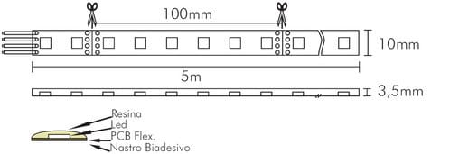 ** Caratteristiche Generali ** Applicazione: Decorativa Tempo di vita L70B50: 20000h Numero cicli di accensione: 10000 cicli Tipo nastro: RGB Colore Supporto: Bianco Tipo di led: smd 3535 n. Led al metro: 60 led/m Lunghezza max in cascata: 5m Rischio fotobiologico: Esente ** Caratteristiche di Illuminazione ** Colore: RGB Flusso Nastro Led: 360lm/m Flusso: R:120lm/m G:240lm/m B:40lm/m Lunghezza d'onda: R:624nm G:525nm B:470nm Angolo di emissione: 120° Warm-up (60%): 0.1s ** Caratteristiche Elettriche ** Potenza Nastro Led: 12W/m Potenza unità minima: 1.2W Tens. funzionamento DC: 24Vdc Dimmerabile: si Alimentatore: Esterno (non incluso) ** Caratteristiche Meccaniche ** Lunghezza nastro: 5m N. Led/taglio: 6 Lunghezza taglio minima: 100mm Larghezza: 10mm Spessore: 3.5mm Fissaggio: Biadesivo 3M Grado di protezione: IP65 Tipo di protezione: Resina Connessioni: Cavo libero ** Caratteristiche Termiche ** Temp. di funzionamento: -10 / 40°C