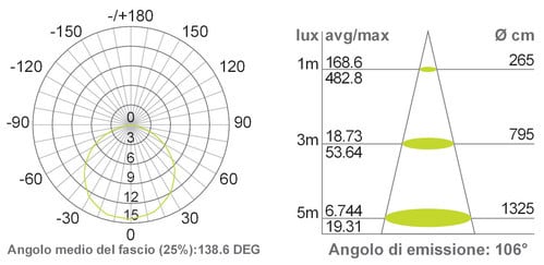 ** Caratteristiche Generali ** Applicazione: Per illuminazione Tempo di vita L70B50: 20000h Numero cicli di accensione: 10000 cicli Fattore di sopravvivenza: 0.9 Tipo nastro: Monocolore Colore Supporto: Bianco Tipo di led: smd 3056 n. Led al metro: 72 led/m Lunghezza max in cascata: 50m Rischio fotobiologico: Esente ** Caratteristiche di Illuminazione ** Colore: Bianco freddo Flusso Nastro Led: 1075lm/m Flusso @ 50cm: 535lm CRI: 80 Angolo di emissione: 110° Warm-up (60%): 0.1s Fattore mantenimento flusso: 0.96 Uniformità colore (SDCM): 6 ** Caratteristiche Elettriche ** Classe energetica: F Potenza Nastro Led: 14W/m Potenza 50cm: 7W Potenza unità minima: 2.324W Fattore di potenza PF: 0.9 Fattore di sfasamento DF: 0.9 Tens. funzionamento AC: 230Vac Tolleranza d'ingresso: ±10% Frequenza: 50Hz Dimmerabile: no ** Caratteristiche Sorgente Luminosa ** Temp. Colore: 6000K ** Caratteristiche Meccaniche ** Lunghezza nastro: 5m N. Led/taglio: 12 Lunghezza taglio minima: 166mm Larghezza: 15mm Spessore: 6.5mm Altezza: 6mm Grado di protezione: IP65 Resistenza agli urti: IK08 Tipo di protezione: Tubo siliconico Connessioni: Cavo libero ** Caratteristiche Termiche ** Temp. di funzionamento: -10 / 40°C La striscia deve essere collegata direttamente alla rete 230V 50Hz. Proteggere l'ingresso tramite fusibile. Si raccomanda l’installazione in posizione inaccessibile a persone o animali. Accessori inclusi: 2 Clip/m