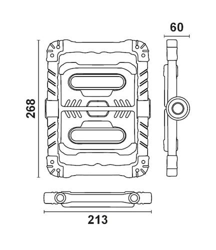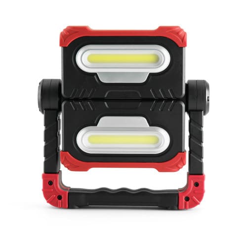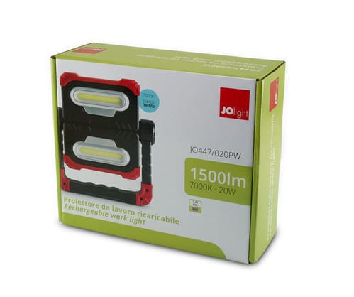 Pratico proiettore a batteria orientabile. Tramite il selettore posto sul retro sarà possibile scegliere la modalità di funzionamento. Modalità di funzionamento: Singolo lato, Doppio lato, Flash. Le sue 2 batterie ai Polimeri di Litio da 3.7V - 4000mAh offre un'autonomia di 3 ore quando è presente la modalità di funzionamento al 100% e di 7 ore in modalità 50%. LED di segnalazione stato di batteria sul retro. La staffa comprende dei potenti magneti per poter fissare agevolmente il proiettore ad una superficie metallica. Comoda funzione di Power Bank tramite il connettore di uscita USB A che consente di ricaricare i propri dispositivi erogando una corrente di 1A. ** Caratteristiche Generali ** Tempo di vita L70B50: 20000h Numero cicli di accensione: 15000 cicli Tipo di led: COB Rischio fotobiologico: Esente ** Caratteristiche di Illuminazione ** Colore: Bianco freddo Flusso: 2000lm ** Caratteristiche Elettriche ** Potenza: 20W Dimmerabile: no Alimentatore: Esterno (non incluso) ** Caratteristiche Sorgente Luminosa ** Temp. Colore: 7000K ** Caratteristiche Meccaniche ** Lunghezza: 213mm Larghezza: 60mm Altezza: 268mm Fissaggio: Staffe Incluse Grado di protezione: IP20 Resistenza agli urti: IK08 Materiale corpo: Plastica Colore corpo: Rosso Lente: Nessuna Tipo Controllo: Interruttore integrato Orientabile: si ** Caratteristiche Termiche ** Temp. di funzionamento: -10 / 40°C Connettore di ricarica Micro USB 1m incluso. Connettore di Uscita USB "A" 5V 1A. Alimentatore NON Incluso: 5V 1A.