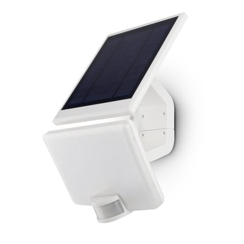 ** Caratteristiche Generali ** Tempo di vita L70B50: 20000h Numero cicli di accensione: 15000 cicli Rischio fotobiologico: Esente ** Caratteristiche di Illuminazione ** Colore: Bianco naturale Flusso: 1500lm CRI: 80 Angolo di emissione: 120° ** Caratteristiche Elettriche ** Potenza: 11W Dimmerabile: no ** Caratteristiche Sorgente Luminosa ** Temp. Colore: 4000K ** Caratteristiche Meccaniche ** Fissaggio: Staffe Incluse, Tramite viti Montaggio: A parete Grado di protezione: IP54 Materiale corpo: Plastica Colore corpo: Bianco Diffusore: Policarbonato opaco Connessioni: Connettori e cavetti inclusi Tipo Controllo: Sensore PIR Lunghezza cavo: 3m Orientabile: si ** Regolazioni ** Periodo di accensione: 10s - 60min Livello di luminosità: 30 - 1000lux ** Caratteristiche Termiche ** Temp. di funzionamento: -10 / 40°C ** Caratteristiche Batteria ** Pacco batteria incluso: Li-Ion 18650 4000mAh Durata: 1h (100% luminosità), 18h (5% luminosità) Tempo di ricarica: 10h ** Caratteristiche Pannello solare ** Potenza: 2,5W Tensione Voc: 5,5V Lunghezza cavo: 3m ** Caratteristiche PIR ** Angolo: 120° Area di rilevamento: 10m Altezza di installazione: Max 4m ** Modalità di funzionamento ** I: la lampada sarà spento fino al rilevamento del movimento, dove si accenderà al 100%; II: la lampada rimarrà accesa al 5% fino al rilevamento del movimento, dove si accenderà al 100%; ** Contenuto confezione: ** - Proiettore + pannello solare; - Kit di fissaggio; - Istruzioni