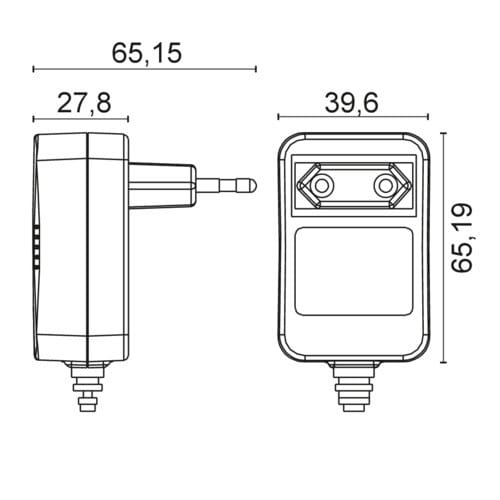 ** Caratteristiche Generali ** Tecnologia: switching Costruzione: plugin Tipo regolazione: CV Classe isolamento: II Grado Protezione: IP20 ** Caratteristiche Elettriche ** Tensione d'ingresso: 100‑240Vac Tolleranza d'ingresso: -10% +6% Frequenza: 50/60Hz Potenza: 24W Tensione d'uscita: 24V Corrente d'uscita: 1000mA Regolazione di carico: ±5% Regolazione di linea: ±5% Tolleranza tensione d'uscita: ±5% Ripple: