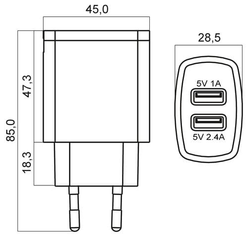 ** Caratteristiche Generali ** Tecnologia: switching Costruzione: plugin Tipo regolazione: CC + CV Classe isolamento: II Grado Protezione: IP20 ** Caratteristiche Elettriche ** Tensione d'ingresso: 100‑240Vac Tolleranza d'ingresso: -10% +6% Frequenza: 50/60Hz Potenza: 17W Tensione d'uscita: 5V Corrente d'uscita: 3400mA Regolazione di linea: ±5% Tolleranza tensione d'uscita: ±5% Protezioni: sovraccarico, sovratemperatura, corto circuito ** Caratteristiche Meccaniche ** Dimensioni (LxWxH): 85 x 28.5 x 45mm Raffreddamento: passivo Materiale contenitore: Plastico Colore: Bianco Cavo d'uscita: nessuno Connettori: USB tipo"A" ** Caratteristiche Termiche ** Temperatura di lavoro: 0/30°C