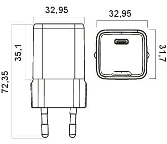 ** Caratteristiche Generali ** Tecnologia: switching Costruzione: plugin Tipo regolazione: CC + CV Classe isolamento: II Carica rapida: Power Delivery 3.0 Grado Protezione: IP20 ** Caratteristiche Elettriche ** Tensione d'ingresso: 100‑240Vac Tolleranza d'ingresso: -10% +6% Frequenza: 50/60Hz Potenza: 30W Corrente d'uscita: 3000mA Tensione d'uscita: 5 - 20V ** Caratteristiche Meccaniche ** Dimensioni (LxWxH): 72.35 x 32.95 x 31.7mm Raffreddamento: passivo Materiale contenitore: Plastico Colore:Nero Cavo d'uscita: nessuno Connettori: USB tipo"C" ** Caratteristiche Termiche ** Temperatura di lavoro: 0/40°C