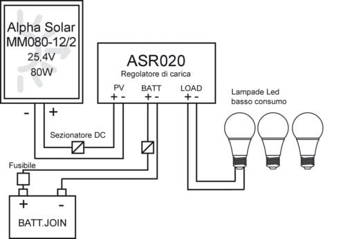 Per il suo funzionamento è necessario completare limpianto con una batteria al piombo 12V AGM o GEL della capacità consigliata in tabella.