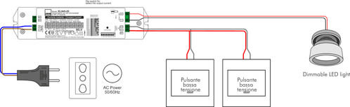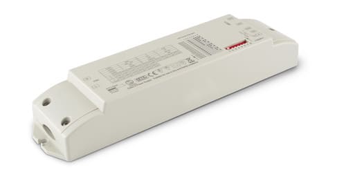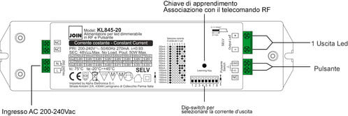 ** Caratteristiche Generali ** Tipo regolazione: CC Classe isolamento: II Correzione PF: Con PFC Dimmerabile: si Dimmerazione: Pulsante, RF Grado Protezione: IP20 ** Caratteristiche Elettriche ** Tensione d'ingresso: 200‑240Vac Tolleranza d'ingresso: -10% +6% Frequenza: 50/60Hz Fattore di potenza: >0.93 Potenza: 50W Corrente d'uscita: 250 - 1500mA Tensione d'uscita: 8 - 48V Tensione d'uscita massima: 55V n. led serie: 3-14 Regolazione di carico: ±1% Regolazione di linea: ±1% Tolleranza tensione d'uscita: ±5% Protezioni: sovratensione, sovratemperatura, corto circuito ** Caratteristiche Meccaniche ** Dimensioni (LxWxH): 210 x 50 x 32mm Raffreddamento: passivo Materiale contenitore: Plastico Colore: Bianco Connessioni: morsetti a vite ** Caratteristiche Termiche ** Temperatura di lavoro: -20/45°C Temperatura involucro: 75°C ** Note: ** Il dispositivo mantiene memoria dell'ultimo modo di funzionamento impostato anche dopo aver spento e riacceso l'alimentazione.