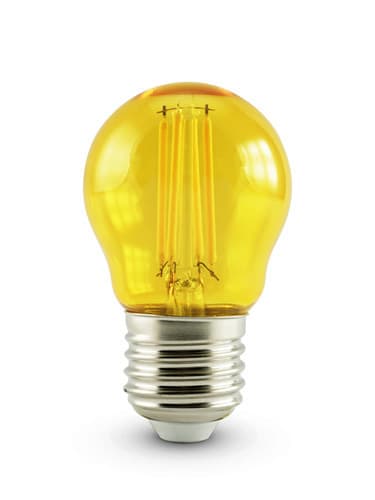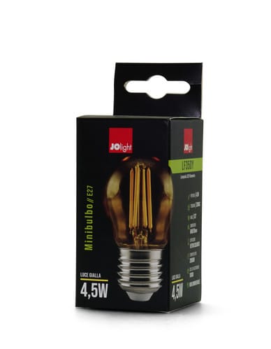 ** Caratteristiche Generali ** Tipo lampada: Mini-Bulbo Tempo di vita L70B50: 20000h Numero cicli di accensione: 10000 cicli Tipo di led: Filamento Rischio fotobiologico: Esente ** Caratteristiche di Illuminazione ** Colore: Giallo CRI: 80 Angolo di emissione: 360° Starting time: 0.2s ** Caratteristiche Elettriche ** Potenza: 4.5W Tens. funzionamento AC: 230Vac Tolleranza d'ingresso: ±10% Frequenza: 50-60Hz Dimmerabile: no ** Caratteristiche Meccaniche ** Attacco: E27 Altezza: 80mm Diametro: ø45mm Diffusore: Vetro colorato ** Caratteristiche Termiche ** Temp. di funzionamento: -10 / 40°C