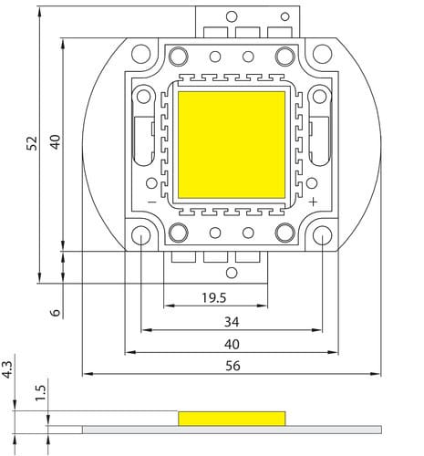 ** Caratteristiche Generali ** Tipo di led: COB ** Caratteristiche di Illuminazione ** Colore: Bianco caldo Flusso: 2000lm CRI: 80 Angolo di emissione: 120° ** Caratteristiche Elettriche ** Potenza: 20W Corrente ingresso max: 700mA Tens. funzionamento DC: 30‑34Vdc ** Caratteristiche Sorgente Luminosa ** Temp. Colore: 3000K ** Caratteristiche Meccaniche ** Lunghezza: 56mm Larghezza: 40mm ** Caratteristiche Termiche ** Temp. di funzionamento: -10 / 70°C ** Attenzione ** Alimentare solo a corrente limitata. Utilizzare un dissipatore adeguato. ** Alimentatori consigliati: ** Per 1 led: KL842-02