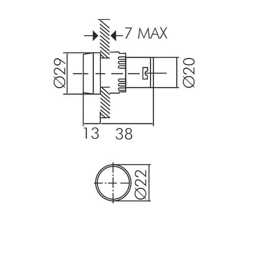 ** Caratteristiche di Illuminazione ** Colore: Giallo ** Caratteristiche Elettriche ** Corrente ingresso max: 20mA Tens. funzionamento AC: 230Vac ** Caratteristiche Meccaniche ** Lunghezza: 51mm Diametro: ø29mm Montaggio: a pannello Foro incasso: ø22mm Grado di protezione: IP45 Materiale corpo: Plastica Colore corpo: Nero Connessioni: Morsetti a vite