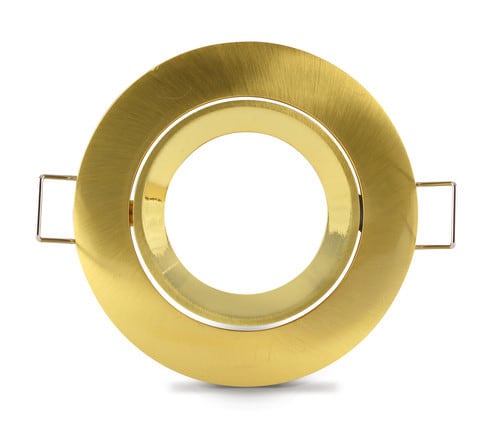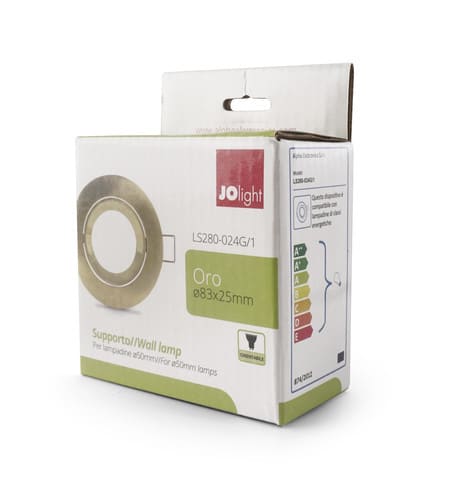 Caratteristiche Porta lampada professionale in metallo adatto per installazioni da incasso. Fissaggio lampada tramite ghiera a scatto. Rotazione: -35° +35° Adatto per uso interno. ** Caratteristiche Elettriche ** Potenza max installabile: 50W **Caratteristiche Meccaniche ** Altezza: 25mm Diametro: ø83mm Foro incasso: ø75mm Materiale corpo: Zamak (Zinco-Alluminio) Colore corpo: Oro Finitura: Lucida Orientabile: si
