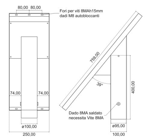 Elemento testa palo zincato adatto per pannelli da 70W, 105W, 140W e 180W. Inclinazione: 51° Attacco per pali da 80 a 90mm. Bulloneria inclusa: - 6 viti TE MA8 h15mm - 4 dadi autobloccanti MA8 I profili per il fissaggio dei pannelli non sono inclusi. Tali profili devono essere ordinati separatamente. ** Avvertenze ** Il prodotto in oggetto è un componente. Il montaggio deve essere affidato a personale qualificato; Il pannello deve essere installato ad una altezza da terra non superiore a 4m; Prima di procedere controllare il contenuto delle scatole; Assicurarsi che i dadi siano ben serrati da non consentire la rotazione del pannello attorno al palo e/o il movimento di alcuna parte; Il dimensionamento del palo è a carico del fornitore, Alpha Elettronica declina ogni responsabilità sul corretto dimensionamento; Alpha Elettronica s.r.l. declina ogni responsabilità per danni, ferite o malfunzionamenti derivanti da un non corretto assemblaggio, montaggio o da un uso non corretto del prodotto.