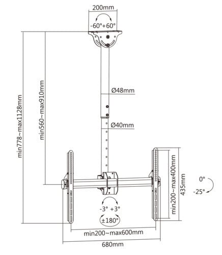Installabile anche su soffitti inclinati: regolazione +60°-60°. Estensione da 560-910mm. ** Caratteristiche Generali ** Funzionalità: Orientabile Tipologia montaggio: Da soffitto Adatto per tv da: 37"- 70" Compatibilità VESA Max: 600x400mm Compatibilità VESA: 200x200, 300x300, 400x200, 400x400, 600x400 Estensione: Braccio doppio Rotazione (Pivot): -3° +3° Inclinazione (Tilt): -25° +0° Orientamento (Swivel): -180° +180° Colore: Nero ** Caratteristiche Meccaniche ** Avanzamento TV: Manuale Materiale: Acciaio Dimensioni (WxH): 1560mm Distanza dal muro: 156cm Portata: 50Kg Bolla di livello: No Sistema di bloccaggio: No Gestione cavi: Si Innesto a baionetta: No Kit di montaggio: Incluso