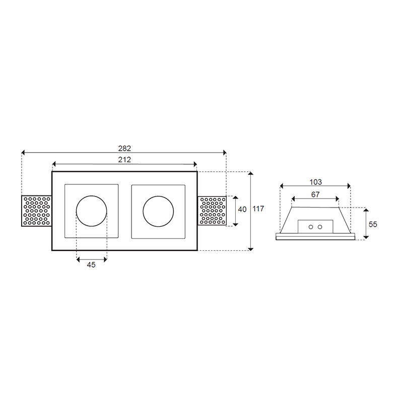 Una volta fissato nel controsoffitto è possibile procedere con la “rasatura” e la verniciatura. Si otterrà così un’installazione invisibile del faretto Corpo in gesso. Per lampadine Ø 50 mm. Completo di portalampade GU10 e MR16 DOPPIO. Incasso in gesso,di forma rettangolare.