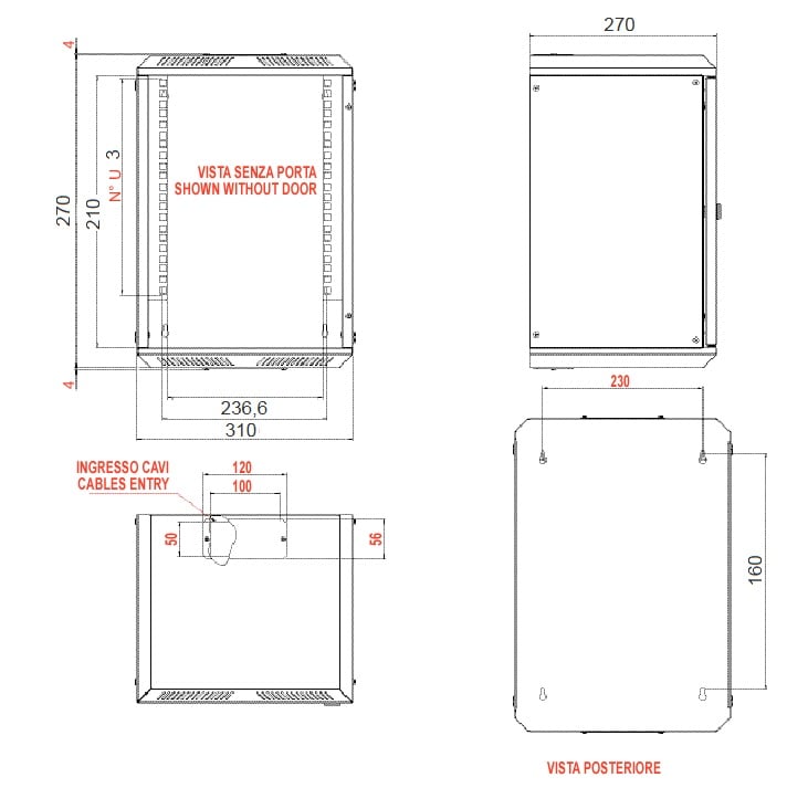 Armadio mini rack 10" per networking, nato per piccole installazioni. Può essere installato a muro. I montanti 10" sono regolabili in profondità, i pannelli laterali e la porta sono asportabili. La porta garantisce un'apertura di 180°. Contenitore, portae pannelli in acciaio verniciato RAL 7035. Montanti 10" in acciaio zincato.