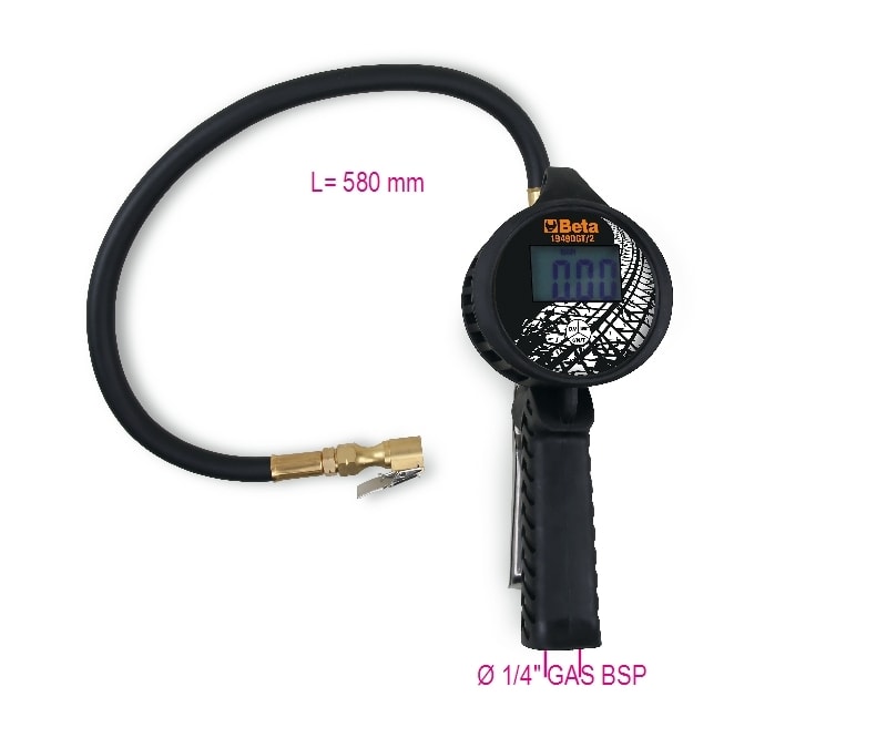 Caratteristiche: ? Corpo interamente rivestito in gomma antiurto ? Leva d'azionamento in metallo ? Pressione di esercizio 0,5?12 bar, 7?174 psi ? 4 unita di misura, bar/psi/kpa/kgf ? Display LCD retroilluminato ? Risoluzione 0,05 bar ? Spegnimentoautomatico dopo 1,5 minuti ? Lunghezza tubo 58 cm ? Rotazione del tubo a 360? ? Alimentazione 2 batterie AAA ? Attacco aria 1/4